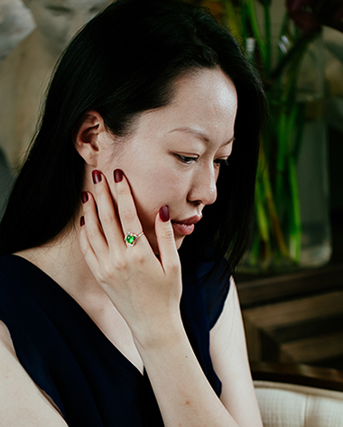 设计了俏丽的花朵,用红碧玺和祖母绿表达红绿相间的花红与枝叶