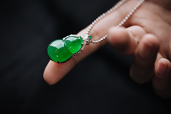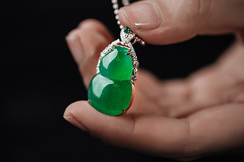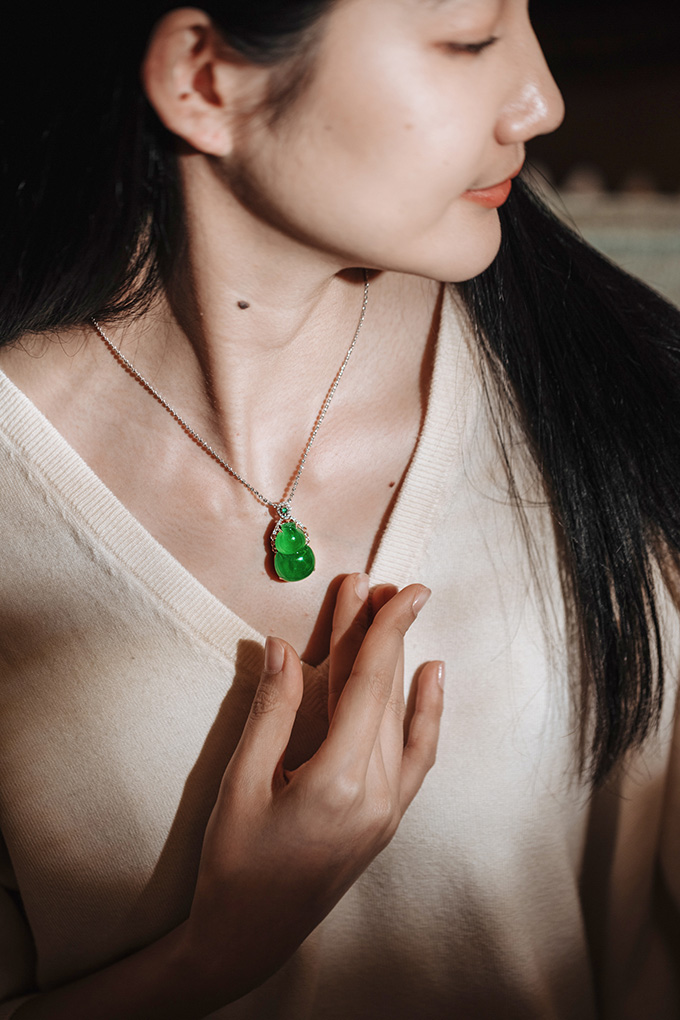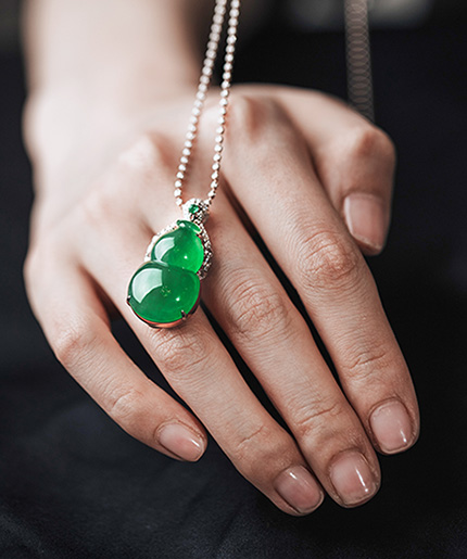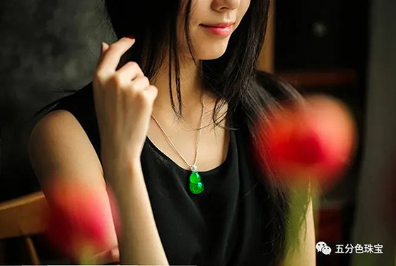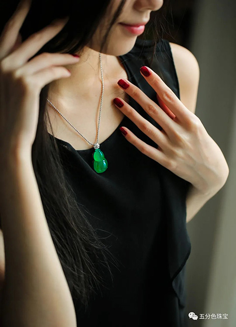 PS: 满绿件是挂件中最贵的品类。市面上浓绿翡翠大多是干的新种,没什么种水。这枚葫芦绿色又浓郁又水灵,形也饱满,少见的老坑美翠,收藏级美翠。