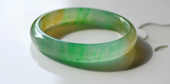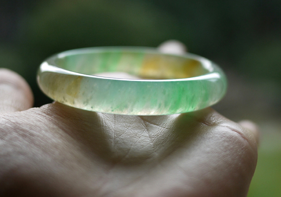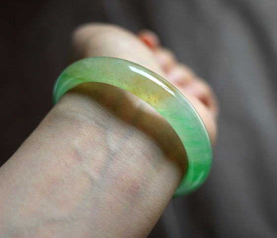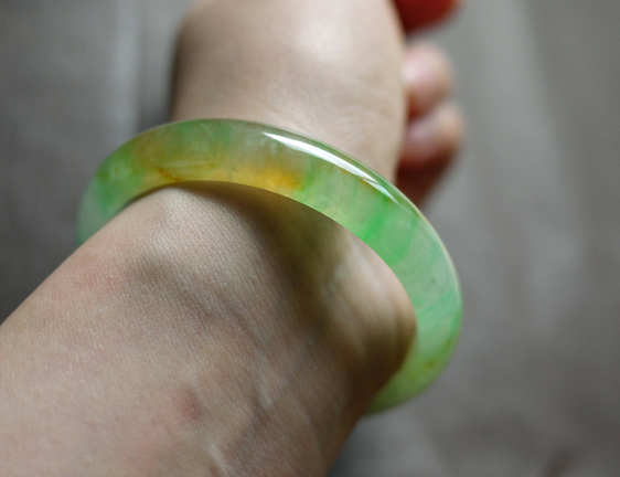 黄色很化地融在艳绿丝里,这是老种黄加绿的特征(如果黄只是皮色,是不会和玉肉中的绿融合的)。庆幸在雨中来回往返三趟,加了好几次价,最后到车库都拿好车了,还是决定返回,把它买下来。当时有种直觉,觉得如果错过了,就可能再也找不到了.现在看来,女人的直觉是对的。后来也看到很多黄加绿,再也没有这支的风采。