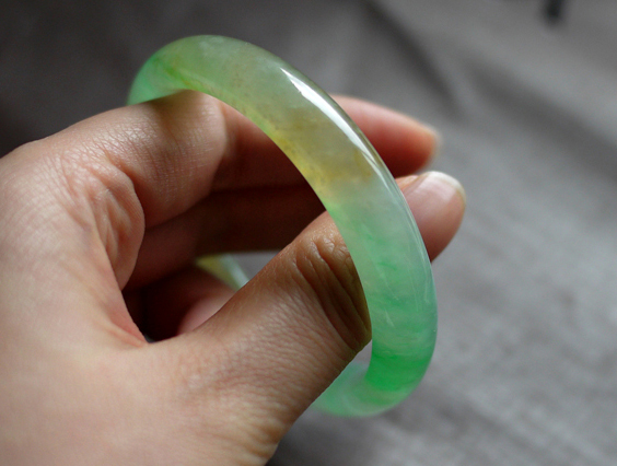 这只镯的艳,很难以语言描述,清新兼具艳丽,很特别.应该是木那种的缘故,继承了一向独特的色和种.种比我之前想的要水润的多,严格来说,它只是冰糯种.但和一般的冰糯又不一样.在光线下,镯子内部会自然起水润荧光,盈盈的艳绿从镯体透出来(一般只有种到冰玻种才有这样的特征),经常看得我愣好一阵,内心赞叹,竟真有这样的美玉存在.看过很多镯子,这样感觉的,从没见过.