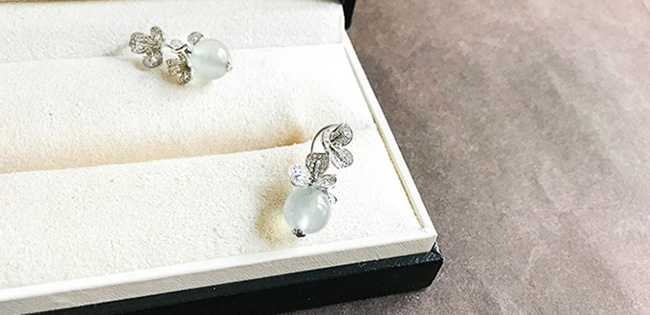 现在翡翠镶嵌上多用玫瑰金。其实素色的白金,如果用的好会温雅大气,更胜一筹。收藏级的东西有时候需要端庄,典雅,过于活泼反显轻浮。珠链是低调的奢华,耳环也应是,所以就定白金和碎钻来镶耳环,花朵要求师傅做立体些。