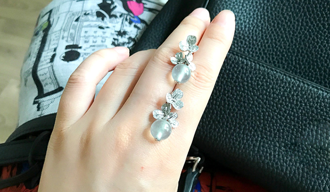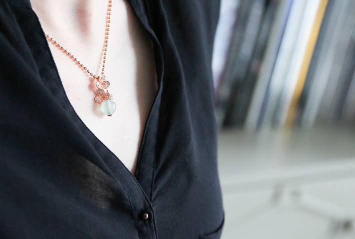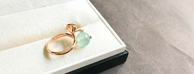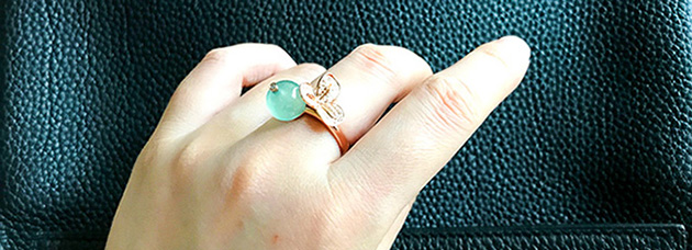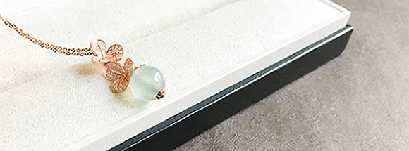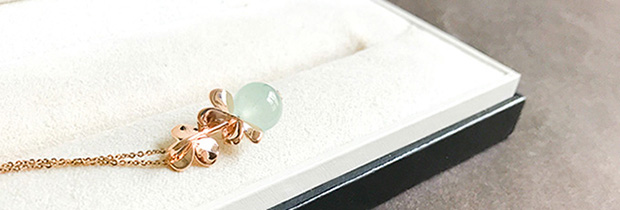 另有两颗淡绿的小珠子。想做一套小首饰,活泼点,穿休闲服也可以佩戴。承袭花果之意,项链,做成一件垂挂的玲珑小坠,可以拉长整体比例更显脖颈纤长。小戒指是一花一果可活动的,指间旋转,和玲珑小坠应和。可随意搭配的一套。