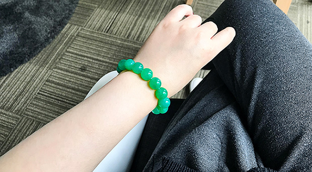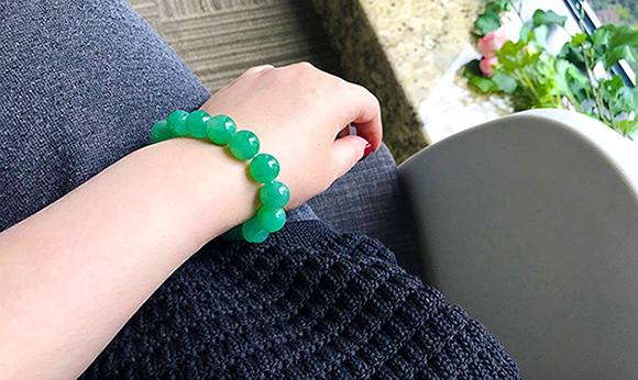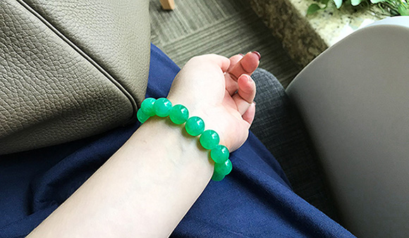 所以我对绿珠串没什么奢望,知道难遇到美的。直到相熟货主拿出这一串,击中内心。它温雅又美丽。种是冰糯种但水润,色不浓不淡,清新美貌,虽有暇疵(几百万内满绿珠串都有暇疵),但价格美貌度太吸引人,踌躇了两日,逛遍市场都没有比它美的,赶紧回去收了。