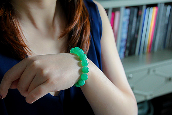 满绿翡翠有时俗套,它却温婉,水润美丽。最近我常戴着它,穿戴时用它作配饰,跳跃又优雅。很好搭配的翠件。
