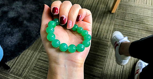 想比手镯安全的翠友可以选珠串,它不怕磕碰。珠子有几颗略小,整体大小较均匀。有些纹裂暇疵,是满绿串的正常暇疵度,上手不明显不影响美观。